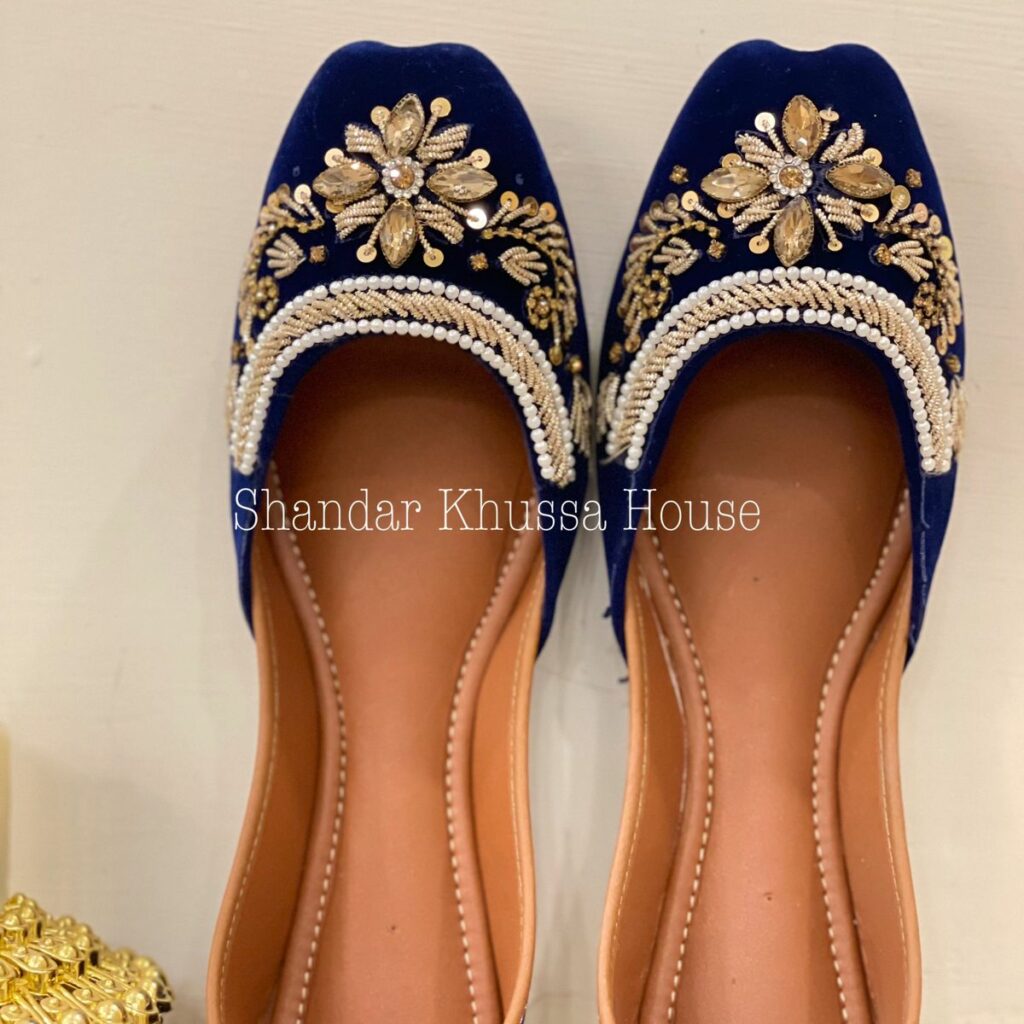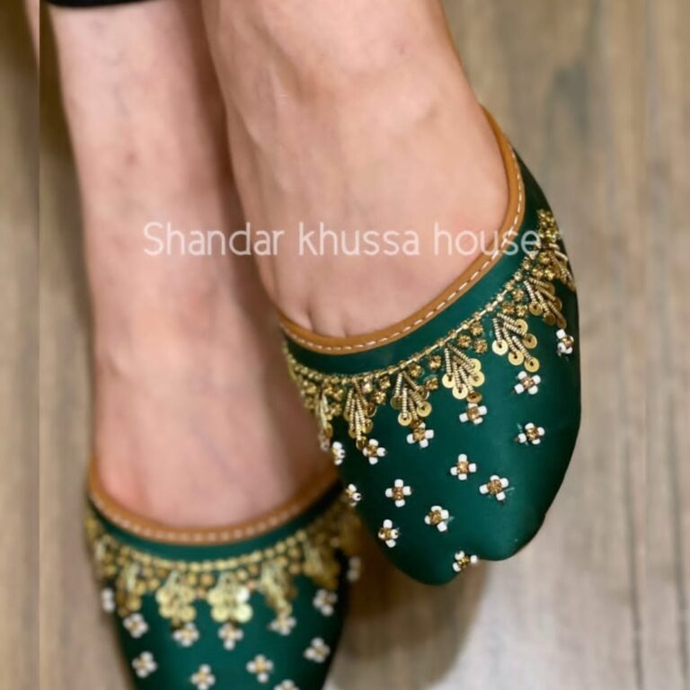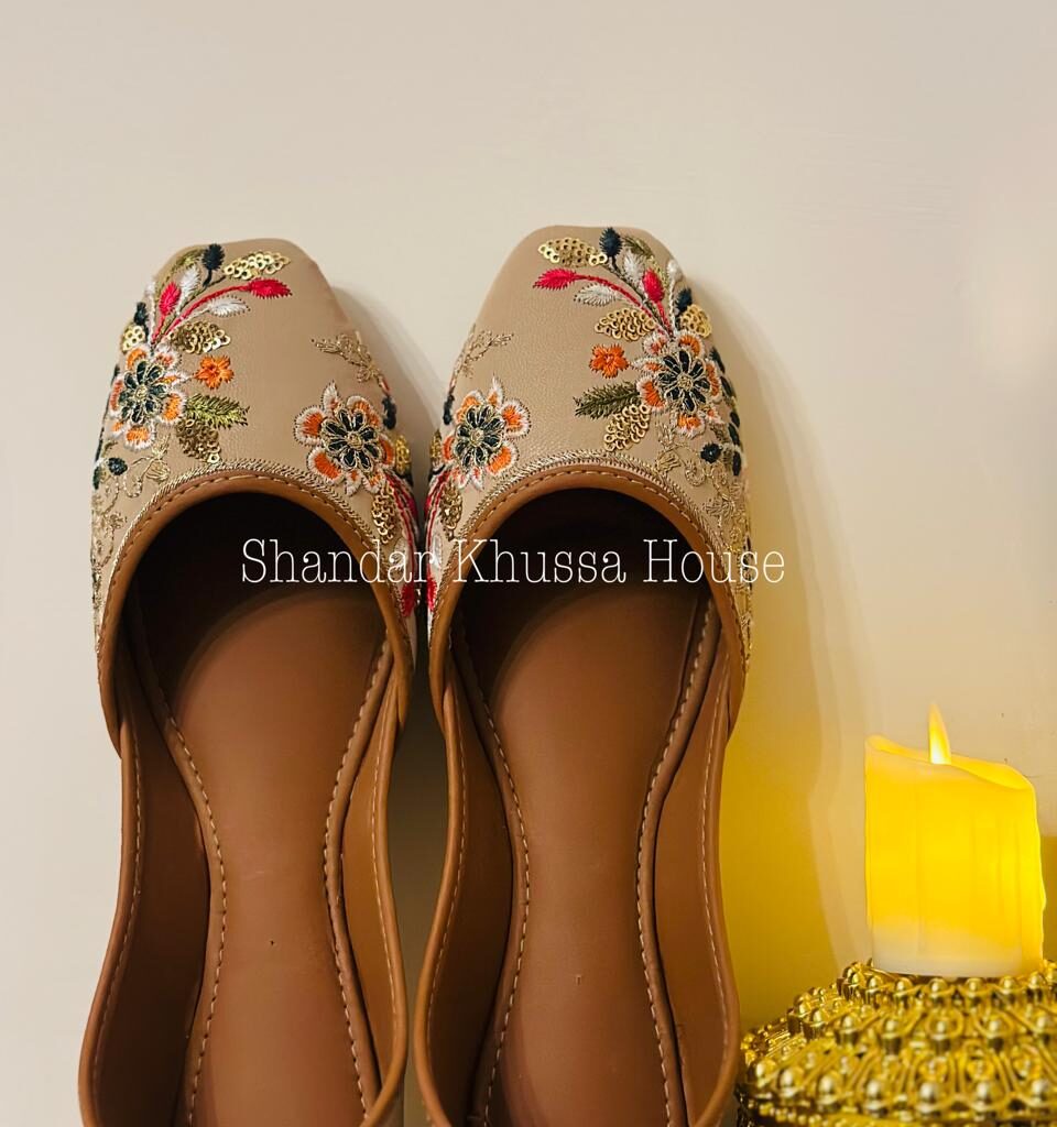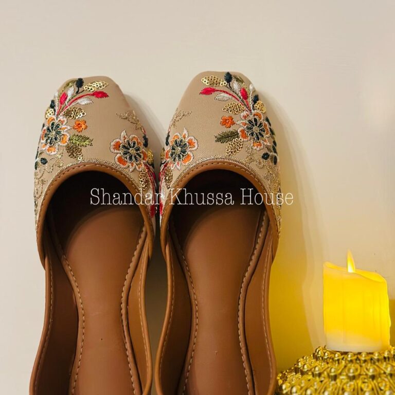 "Skin embroidery khussa by Shandar Khussa House offers a perfect blend of tradition and elegance, featuring intricate handwork that adds